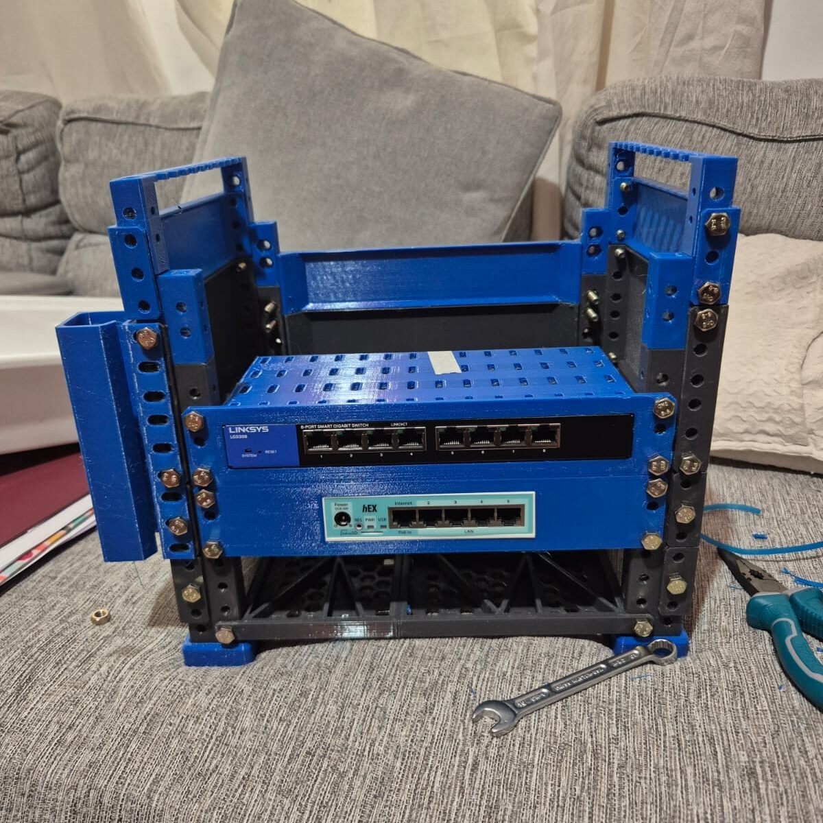 Mediante fui acumulando cosas y complejizando mi infraestructura de red, me di cuenta que necesitaba algo para poder acomodar todo y no tener todo disperso en un mueble. Para esto un rack suele ser de utilidad. Si bien tengo espacio en la oficina, no tengo lugar para montar un rack de 19′, la medida tradicional por así decirlo. Indagando en internet descubrí que existen los racks de 10′, una medida no tan común, pero que cumplía para el tamaño de mis dispositivos de red. El problema de esta es que no se consigue fácilmente, por lo menos en Argentina, y si los hay, son muy costosos. Quería una solución rápida, aunque sea momentánea, y saqué mi artista interior.