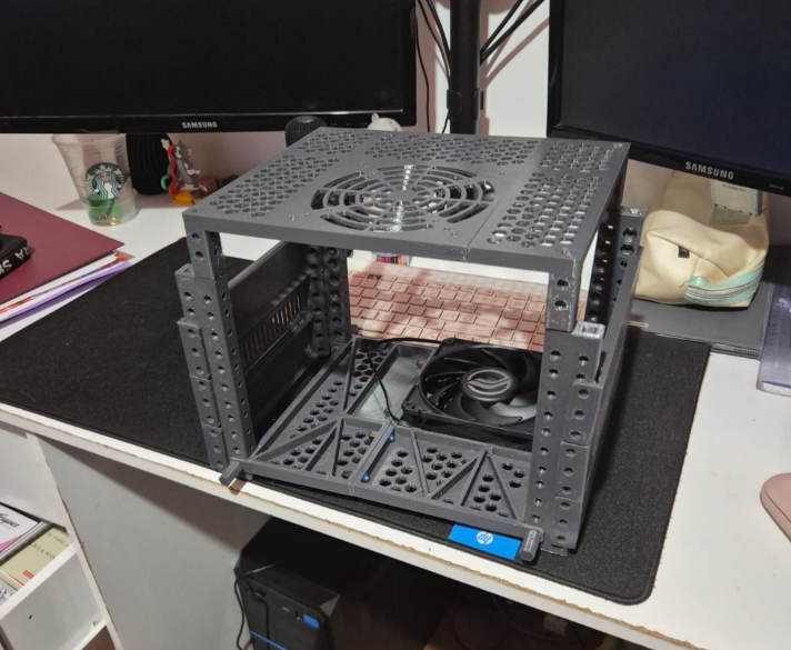 Desde un principio no me convenció, no era practico ni estético, aunque admito que termicamente era muy bueno – un poco overkill el cooler de 140mm de alto caudal si –, me servia a corto plazo. Con el pasar de los días retome la búsqueda y la solución vino por otro lado, la impresión 3D. Las alternativas eran numerosas y espectaculares, pero tengo el limitante de que mi Biqu B1 no es capaz de imprimir piezas tan grandes. Tenia que ser algo modular y que se puedan dividir las piezas grandes para poder hacerlas en impresoras pequeñas. Finalmente di con este proyecto que cumplía a la perfección mis necesidades, con una comunidad que complementaba el trabajo del autor. Sabia que seria un modelo complejo y que a mi maquina le llevaría tiempo, pero le di para adelante. Dejo el link al modelo en Printables.